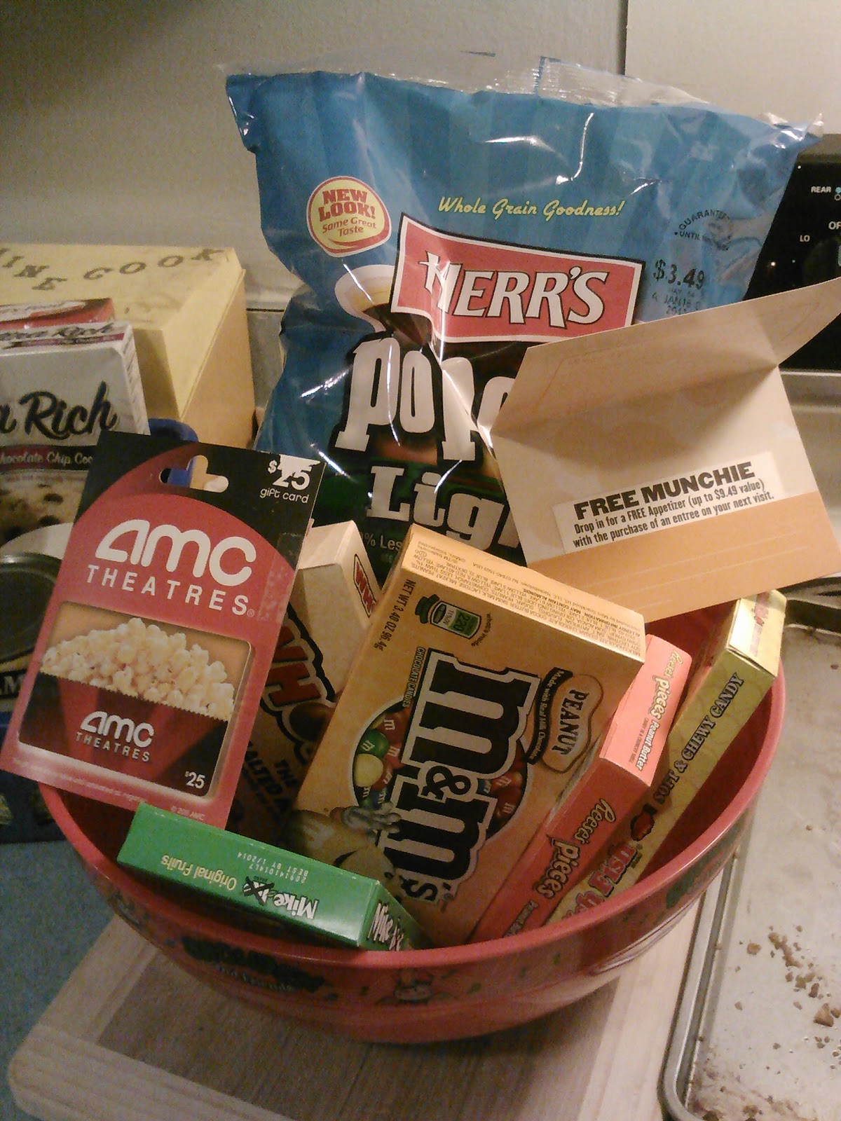 The first is a movie night basket, which was a $25 gift card for AMC, a coupon for a free appetizer at Applebees, five boxes of movie candy and a large bag of plain popcorn in a nice red bowl.